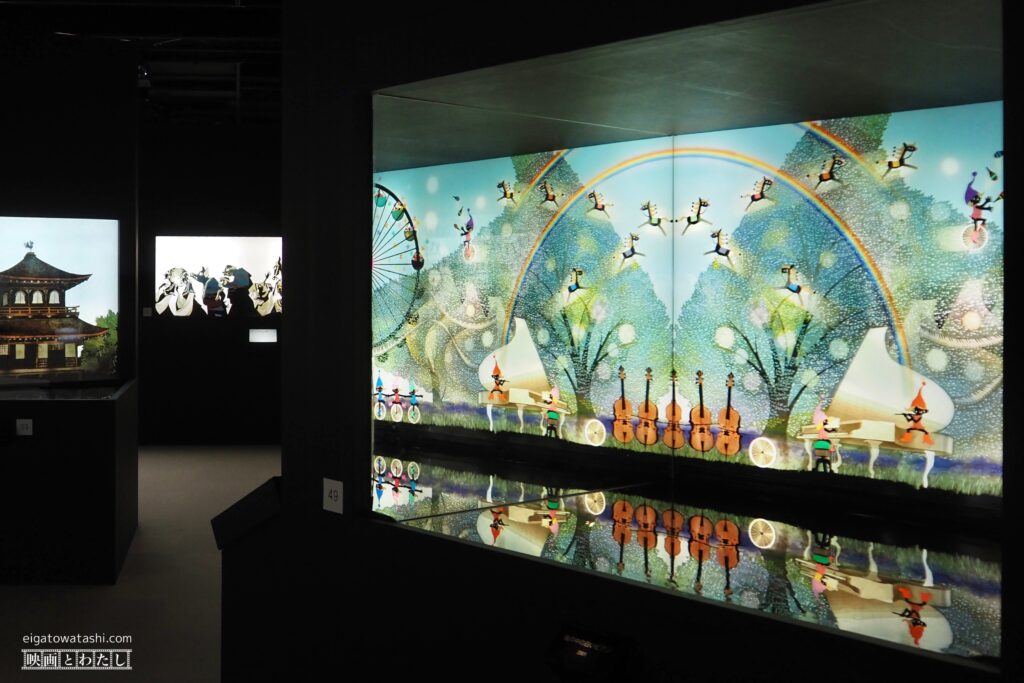 藤城氏の作品のなかでは、こびとや動物、ケロヨンといった様々なキャラクターが同居して、ひとつの世界を作り上げています。なかでも「風の中の白いピアノ」は、水槽と鏡を用いた展示方法をとっており、果てしなく続くメルヘンの世界が堪能できます。