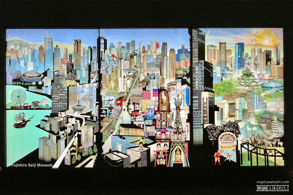 本展のエントランスで来場者を最初に出迎えるのは、横6m×縦3mの大作「日本一大阪人パノラマ」です。大阪の名所が魅力的に描かれ、観客を楽しませます。制作当時はドローンなどの機材はなく、実際に道路を歩いて写真やデッサンに残したり、高速道路を車で何度も走行したそうで、藤城氏は「いろんな角度から撮った写真やデッサンを、一点から見たような作品に仕上げるのが難しかった。大阪を僕なりに懸命に描いた作品です。(本展で)この作品が先頭に飾ってあるのが嬉しい!」とコメントしました。