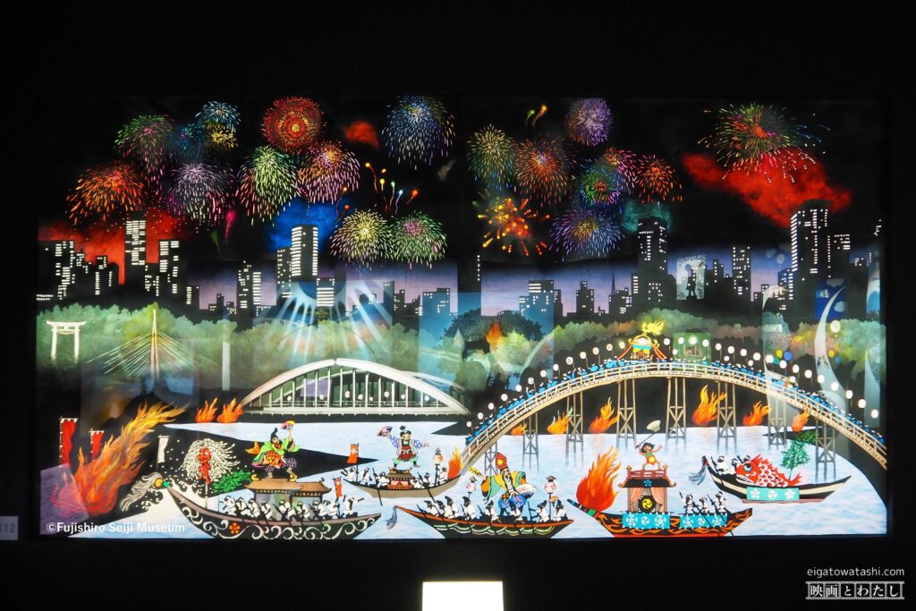 毎年 7月24日、25日に大阪天満宮で開催される天神祭を描いた「天神祭 今昔」は、大阪の夜景や神輿を乗せた船、橋の上では三瀬御神楽を奏し、夜空には花火が上がり、賑やかで活気あふれる大阪の街をじっくりと堪能できます。