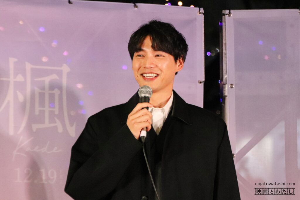 大阪・なんばは、日本における《映画興行発祥の地》としても知られている場所。行定監督は、劇場で映画を見ることの魅力について触れ「この場所(なんば広場)は、すごく活気がありますね。映画みたいな街になったらいいですよね。」と、今後の映画とのコラボレーション企画にも期待を寄せました。イベントも終盤に差し掛かり、福原さんが「見終わった後に、大切な人をもっと大切にしたくなるような、心温まる冬にぴったりな作品です。ぜひ劇場で楽しんでください!」と挨拶し、福士さんが「スピッツさんの『楓』は、27年間ずっと愛されてきた楽曲です。劇場で聴いて、映画を見る前と見た後で皆さんがどう感じるのか楽しみです。」と来場者へメッセージを送りました。最後に、観客が持つペンライトの光とともに、「なんば広場」にある巨大なプレゼントボックスのモニュメントのライトアップ点灯式が行われ、イベントは作品への期待感と温かな光に包まれながら幕を下ろしました。