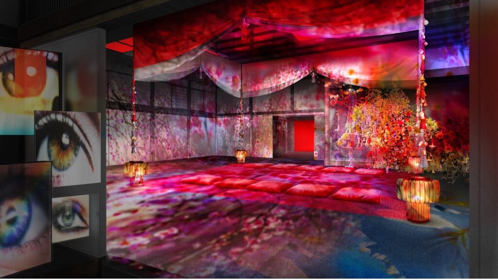 公演はセリフがないノンバーバルの形式で、舞台となる北野天満宮のゆかりある登場人物らが時を超えて集い、伝説の茶会の“幻の二日目”として始まります。蜷川実花 with EiMが手がける登場人物を象徴した様々な部屋を、縦横無尽にパフォーマンスを繰り広げることで、物語は進んでいきます。鑑賞者は作品を“観る側”ではなく “物語の登場人物として参加する側”へと移行する没入を味わいながら、歴史空間で繰り広げられるストーリーにより時空にも没入していきます。観客はまるで時空を超えた目撃者となるような感覚を味わい、没入体験の先へと誘います。