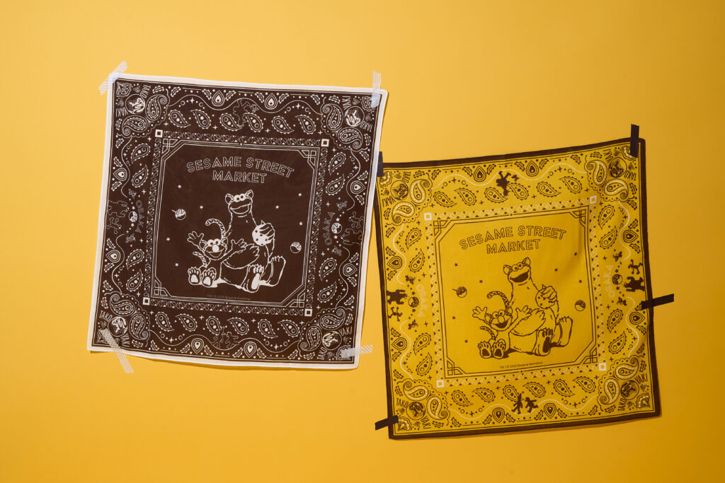 トラのコスチューム姿になったエルモとクッキーモンスター、たこ焼きなど、大阪ならではのモチーフをたっぷりと詰め込んだデザインのバンダナ。大阪らしいイエローとブラックの2カラー展開で、首元や髪、バッグに結んでアクセサリーとして使ったり、お部屋のインテリアとして飾ったりと、様々なアレンジができる万能アイテムです。
