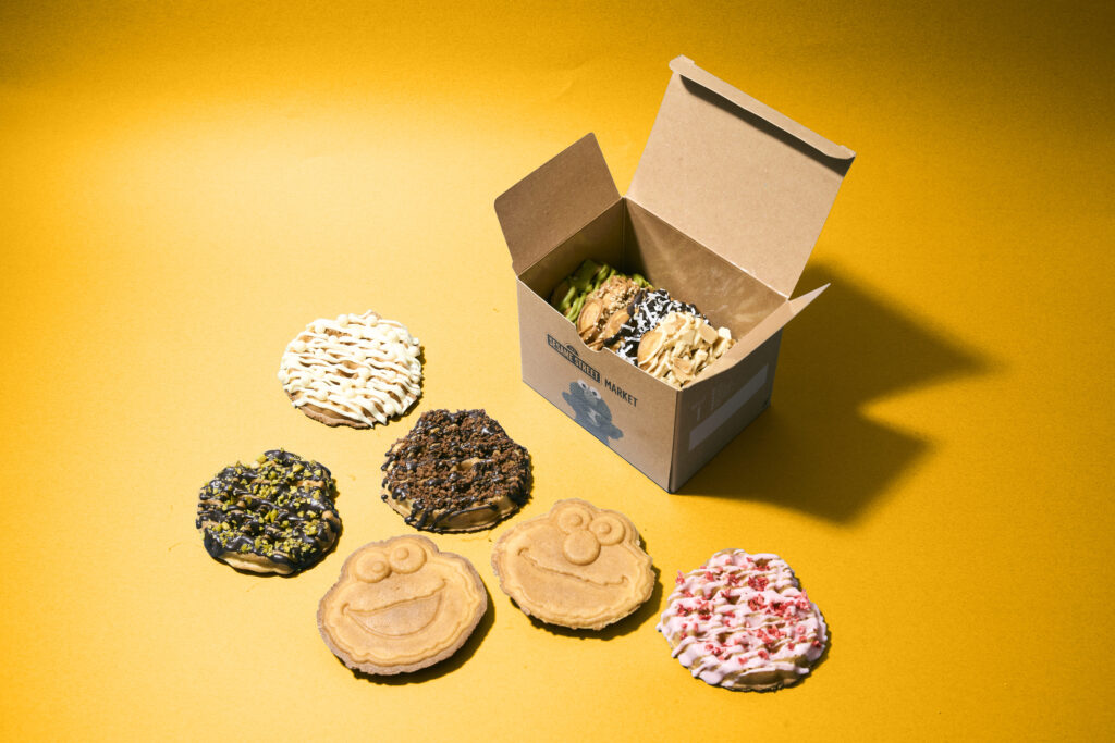 セサミストリートマーケット 阪神梅田本店(以下、阪神店)のオープンに際し、キャラクターたちがトラ姿や法被姿になりきれるコスチュームやピンバッジ、バンダナ、ステッカーなど大阪ならではのモチーフを詰め込んだ阪神店限定アイテムが登場。カフェメニューでは池袋サンシャインシティ店(以下、池袋店)、アーバンドック ららぽーと豊洲店(以下、豊洲店)で展開中のメニューに加え、現在豊洲店限定で展開中のアメリカンワッフルが食べやすいミニサイズになったテイクアウト限定メニューの「アメリカンミニワッフル」の先行販売も!