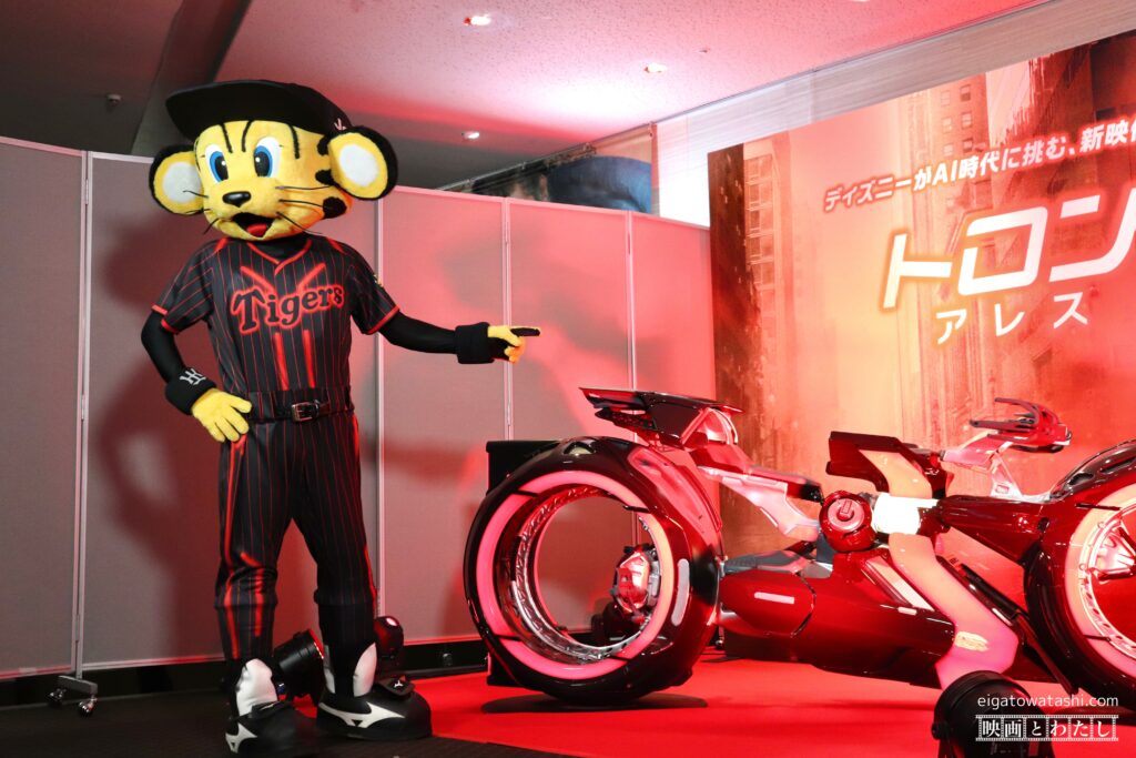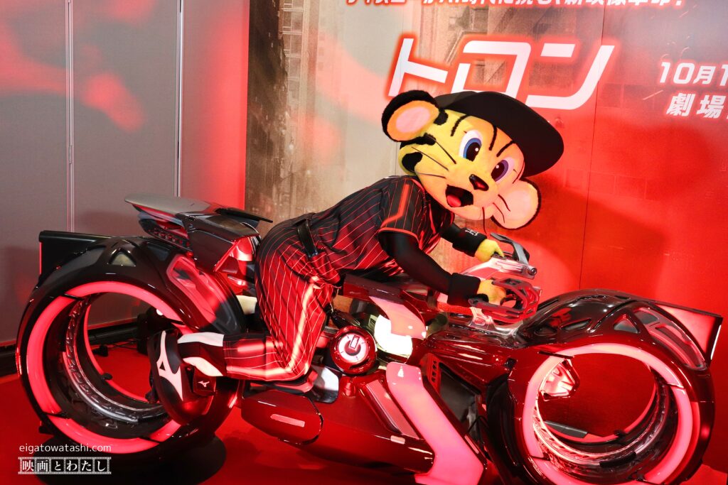 “トロッキー”が登場したのは、「ライトサイクル」をイメージした期間限定のフォトスポット(※1)。本作に登場する「ライトサイクル」は、超高速で疾走し、追跡するパトカーをも真っ二つに割ってしまうほどの赤い光線を放つ危険なバイクです。“トロッキー”は、タイヤをやさしく撫でたり、実際に乗車したりとさまざまなポーズでイベントを盛り上げ、フォトセッションに応じました。さらに、いよいよ今週末からスタートするクライマックスシリーズに向けて、『トロン:アレス』の“ス”を隠した“アレ”のポーズを披露し、チームにエールをおくりました。