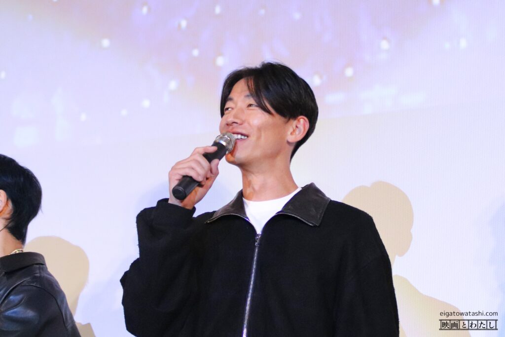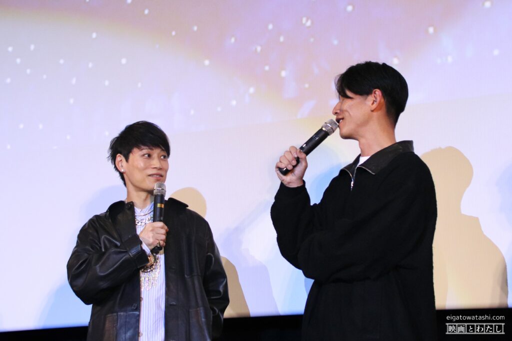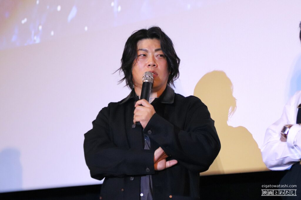 大抜さんの「熱狂に包まれた(上映後の)会場はどうですか?」という質問に対して、彰さんは「そうですね、空調が効いてて大丈夫です。」と話し、信人さんは会場を見渡しながら「よろしくお願いします。」と挨拶。真太郎さんは「なんで(席を)立ってたん?みんな(笑)」と笑いを誘い、誠果さんは「入ってきた時に、すっごいおいしそうな匂いがしてたんですよ。(ポップコーンなど)食べながら映画を楽しんでるなって愛おしく思いましたね。」と笑顔で話しました。