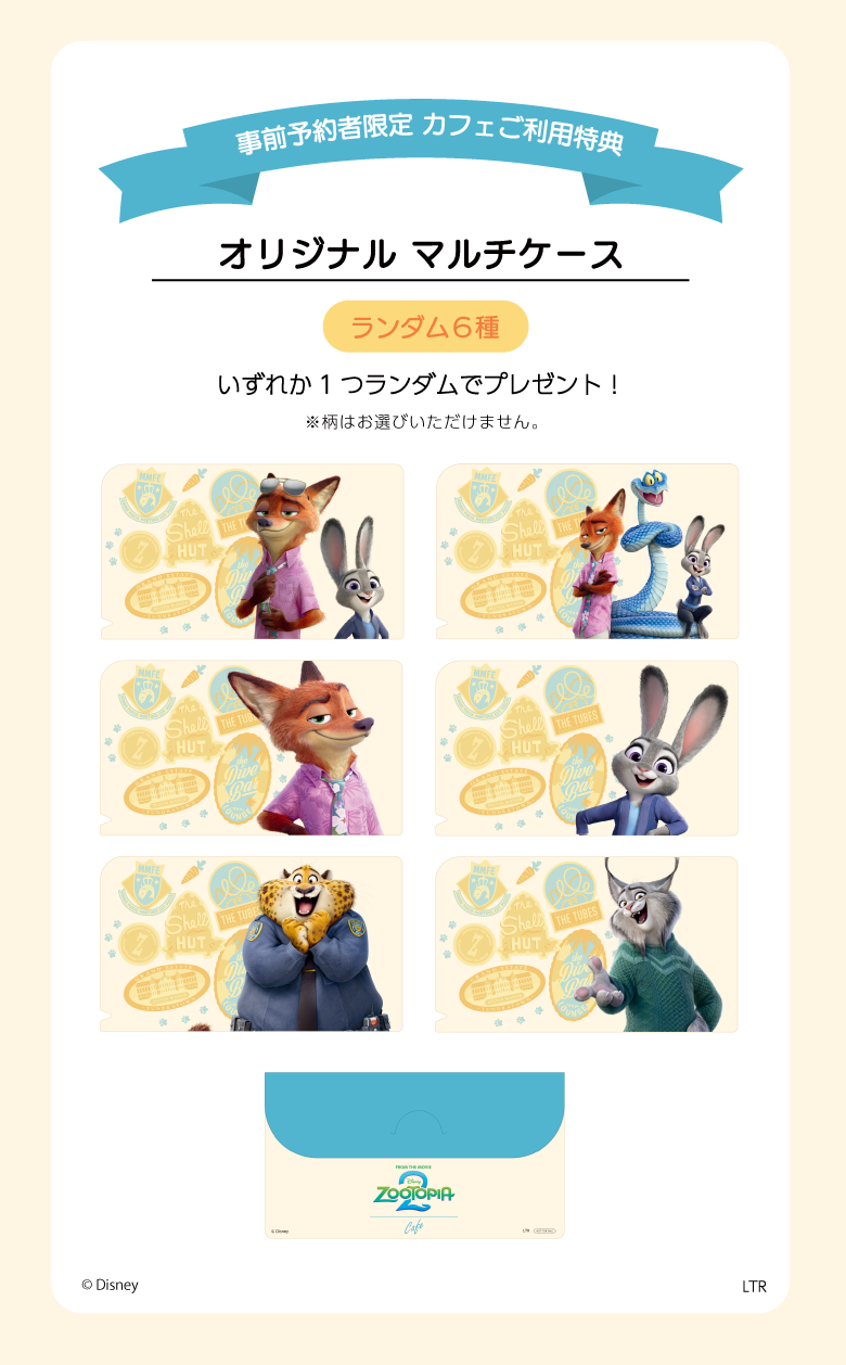 事前予約(税込770円 /1名)をご利用いただき、メニューをご注文いただいた方に「オリジナルマルチケース(全6種)」をランダムで1枚プレゼント。 ※柄はお選びいただけません。